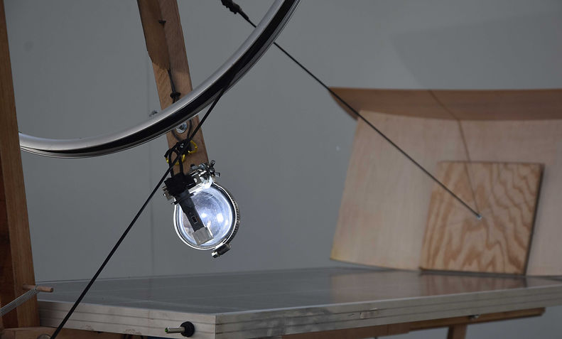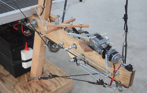 Panneau photovoltaïque 110w, batterie AGM 12v, Moteur électrique a courant continu, régulateur MPPT, ampoule automobile à LED 55w, lentille en verre, bois de récupération, jante de vélo, fils électriques, accastillage, ressorts, câbles, courroies de caoutchouc.